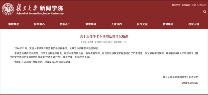 2月25日,复旦大学新闻传播学博士后流动站发布“关于王灿学术不端的处理情况通报”。
